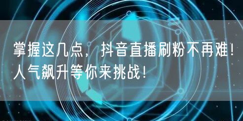掌握上述几点刷粉技巧,抖音直播刷粉不再难!通过不断优化直播策略,你的人气将飙升!挑战自我,成为抖音直播界的明星!快来试试吧!